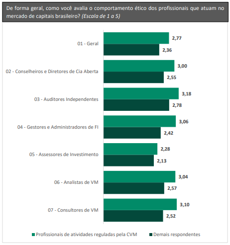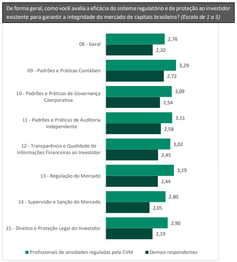 A percepção de integridade do mercado de capitais brasileiro, tanto em relação aos profissionais quanto ao sistema regulatório, está aquém do ideal, revelando baixa confiança e desconfiança sistêmica.