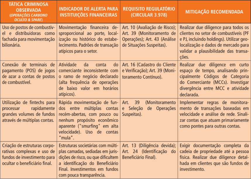 A seguir, uma matriz que traduz as táticas criminosas observadas nas operações em indicadores de alerta práticos para instituições financeiras, associando-os aos requisitos regulatórios e às ações de mitigação recomendadas:
